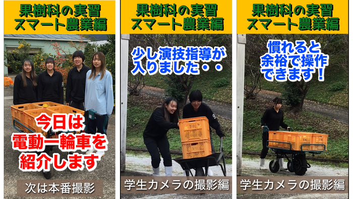 また、ゆずの収穫実習では、一輪車に収穫コンテナを2段積して運搬しており、園地内は悪路で安定性が悪く、労力負担が大きく転倒事故などの危険を伴う作業のため、女子学生には作業をさせてなかったですが、今回女性でも作業ができるアシスト機能のある電動一輪車(電動運搬車)を導入しました。