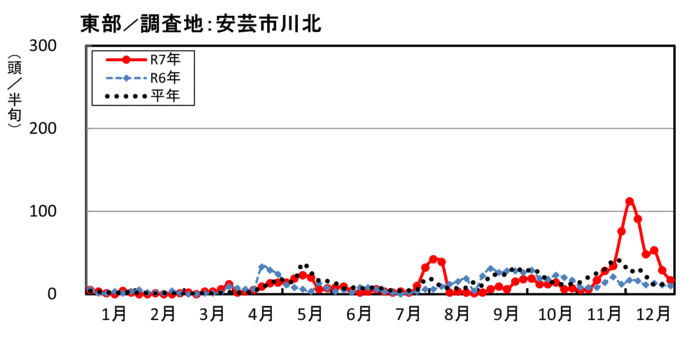 12月に入っても中央部で発生が非常に多いですが、その他の地域では減少しています。今後は気温の低下により野外での活動はほぼなくなると想定されますが、ハウス内では侵入されると継続して発生すると思われますので、確認したら早めに防除しましょう。