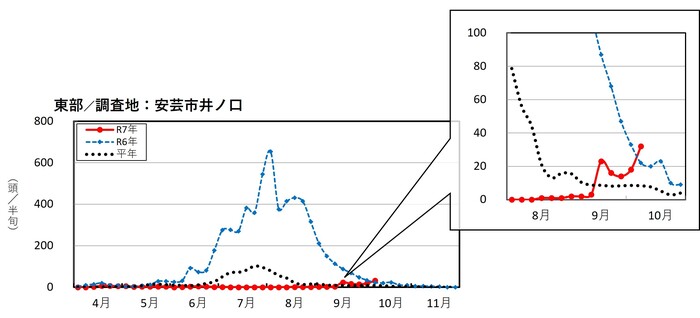 ※3平年値は、本来10年平均のところ、令和6年度異常発生のため平成27年~令和5年の誘殺数の平均