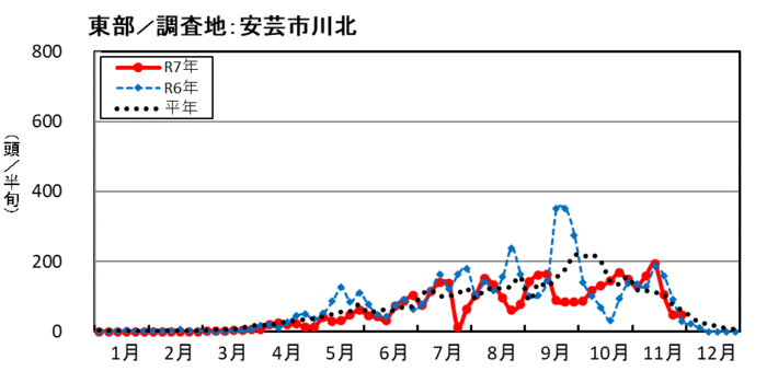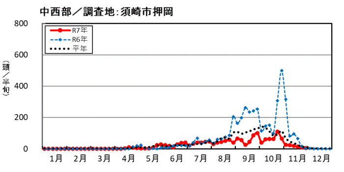 現時点ではほぼ平年並の推移で、今後は気温の低下に伴い野外での活動は鈍化すると想定されます。ただ、ハウス内では侵入されると発生が続くことから、早期発見及び防除に努めましょう。