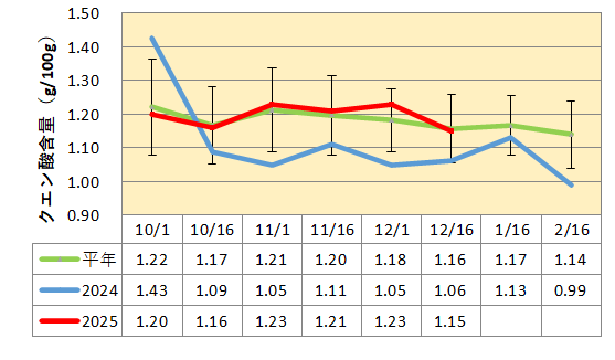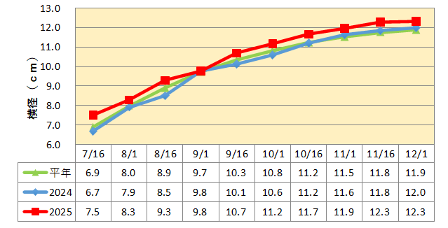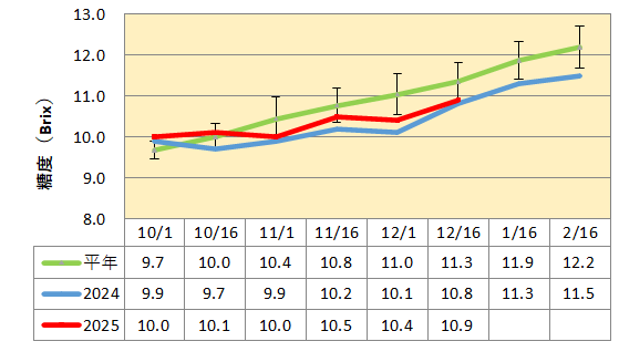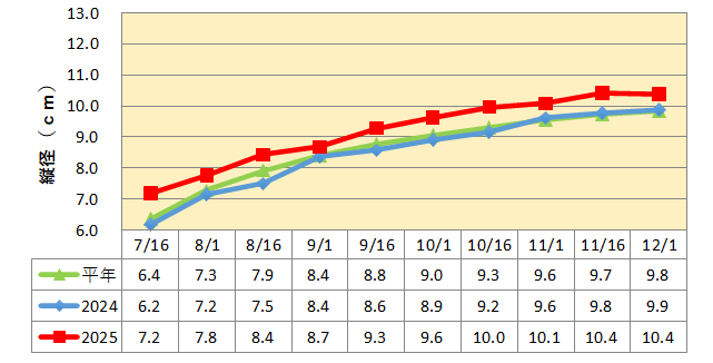 果実肥大は平年並みとなりました。果実品質は、糖度は平年より低く、酸度は平年並みです。