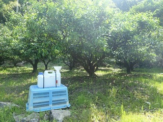 柚子部吉良川支部では、昨年から簡易雨量計による「雨量の見える化」に取り組み、カンキツ黒点病防除に活用しています。今年は新たにモデル園の掲示板に「積算雨量表」を設け、雨量の積算推移や、防除日等も確認(見える化)ができるようなりました。