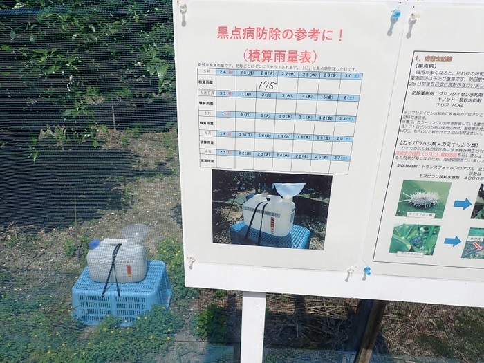 積算雨量表と6月の栽培管理資料掲示(日南) 目盛りは170mmちょっと。そろそろ防除適期(日南)