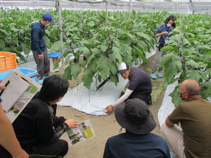 ツアーには県内外から4人が参加し、安芸市の農業や就農支援の紹介、法人経営体と新規就農者の施設訪問、ナスの収穫体験、研修受入農家等との意見交換を行いました。農業改良普及課は、ツアーの企画運営への支援を行いました。