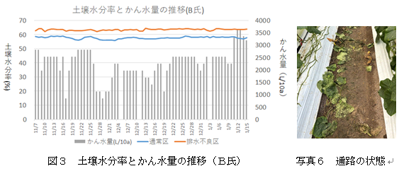 土壌水分率は、12月上旬~1月中旬にかけて排水不良区で50%以上と、通常区に比べ土壌水分率が高まりました(図2)。また、通路は水であふれており、排水不良による生育不良及び作業性の低下が懸念されました(写真5)。なお、冬期のかん水量は1t/10a/日とやや少なかったです。