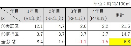 1年目は、実証区で野芝の育苗や定植作業等により8.4時間/100㎡多くなり、2年目は、選択性除草剤散布等で実証区が1時間/100㎡多くなりました。3年目及び4年目は、実証区で1.1時間/100㎡、1.5.時間/100㎡減少し、野芝の定着とともに作業時間が減少しました(表1)。