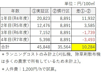 1年目は、野芝の資材費と育苗等の管理労賃で実証区が約12千円/100㎡多くなりました。2年目は、選択性除草剤散布等の経費により、実証区で約3.6千円/100㎡多くなりました。3年目及び4年目は、実証区で約1.8千円/100㎡、約3.5千円/100㎡減少し、野芝の定着により経費が削減されました(表2)。