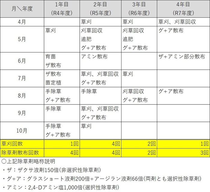 ・使用した選択性除草剤:グラスショート液剤200倍、アージラン液剤66倍、2,4-Dアミン塩1,000倍