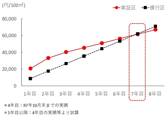 維持経費の試算により、実証区の経費上昇分の回収は、7年目終了時に可能となることが分かりました(図2)。